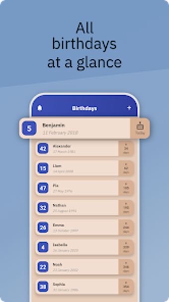 Birthdays, Android platformu için geliştirilmiş bir verimlilik uygulamasıdır. Bu uygulama, yaklaşan doğum günlerini takip etmenizi ve hatırlatmanızı sağlayan pratik bir yardımcıdır. Kullanıcı dostu arayüzü ile doğum günlerini kolayca kaydedebilir ve bu özel günler için birden fazla hatırlatıcı ayarlayabilirsiniz. Bu, hediye planlaması gibi önceden hazırlık yapmanıza olanak tanır.